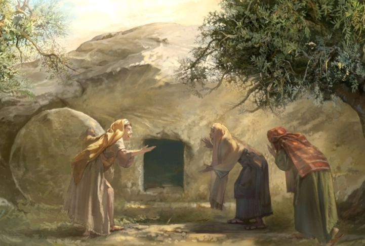 El diumenge, molt de matí, les dones arribaren al sepulcre portant els olis aromàtics que havien preparat i van trobar que la pedra havia estat apartada del sepulcre. Hi van entrar però no hi trobaren el cos de Jesús, el Senyor. Estaven del tot perplexes sobre què havia passat, quan se’ls van presentar dos homes amb vestits resplendents. Esglaiades, es van prosternar. I ells els digueren: