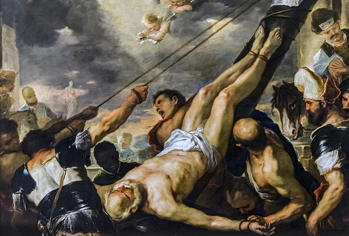 Va ser clavat en la creu, i per desig propi, va ser posat amb el cap cap avall, per diferenciar-se així del seu Mestre. Tot això va succeir a la colina vaticana, on ara s'aixeca la basílica de Sant Pere.
