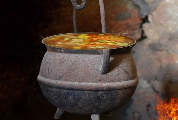 Ell va deixar caure la pedra a l'aigua i amb gran cerimònia va tastar una cullerada i va exclamar: “Deliciosa! L'única cosa que necessita són unes quantes patates”. “Jo tinc patates a la meva cuina!”, va cridar una dona. I en pocs minuts estava de tornada amb una gran font de patates pelades que van anar dretes a l'olla. L'estrany va tornar a tastar el beuratge. “Excel·lent!”, va dir, “si tinguéssim una mica de carn, faríem un cuit més apetitós...”. Una altra dama va sortir i va tornar amb un gran tros de carn que l'estrany va fer fora a l'olla.