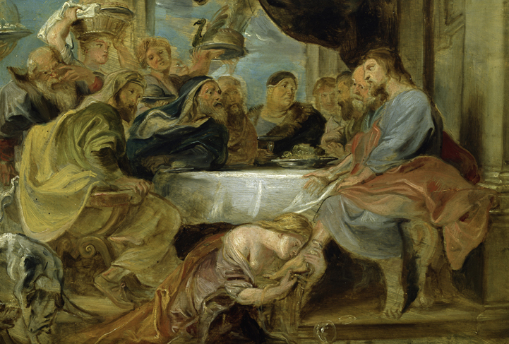 Un fariseo invitó a Jesús a comer con él. Jesús entró en la casa del fariseo y se sentó a la mesa. Había en el pueblo una mujer que era pecadora. Cuando supo que Jesús estaba a la mesa en casa del fariseo, fue allí con un frasco de alabastro lleno de perfume y se quedó llorando a los pies de Jesús, detrás de él. Le mojaba los pies con las lágrimas, se los secaba con los cabellos, los besaba y los ungía con perfume. El fariseo que había invitado a Jesús, al ver esto, pensó: "Si este fuera profeta, sabría quién es esta mujer y qué clase de vida lleva; es una pecadora". Jesús le dijo: