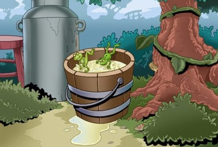 La tercera rana tenía un gran deseo de vivir. No reflexionó mucho, pero quería salir de aquel apuro. No supo hacer otra cosa que expresar tal deseo: se movió, se agitó, se rebeló contra su suerte... y tanto se movió y luchó que la leche se volvió mantequilla, sacudida por tanto movimiento. Y esta tercera rana fue la que se salvó”.